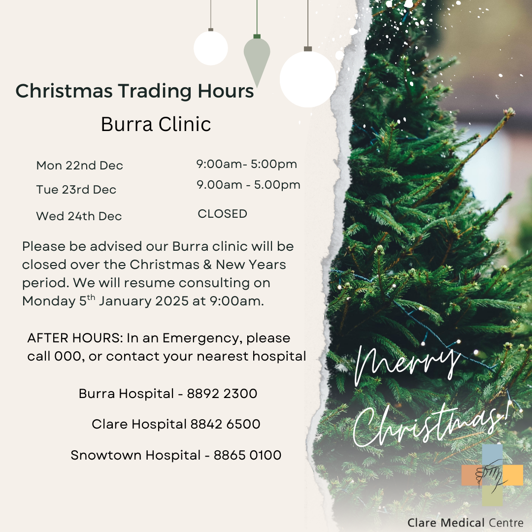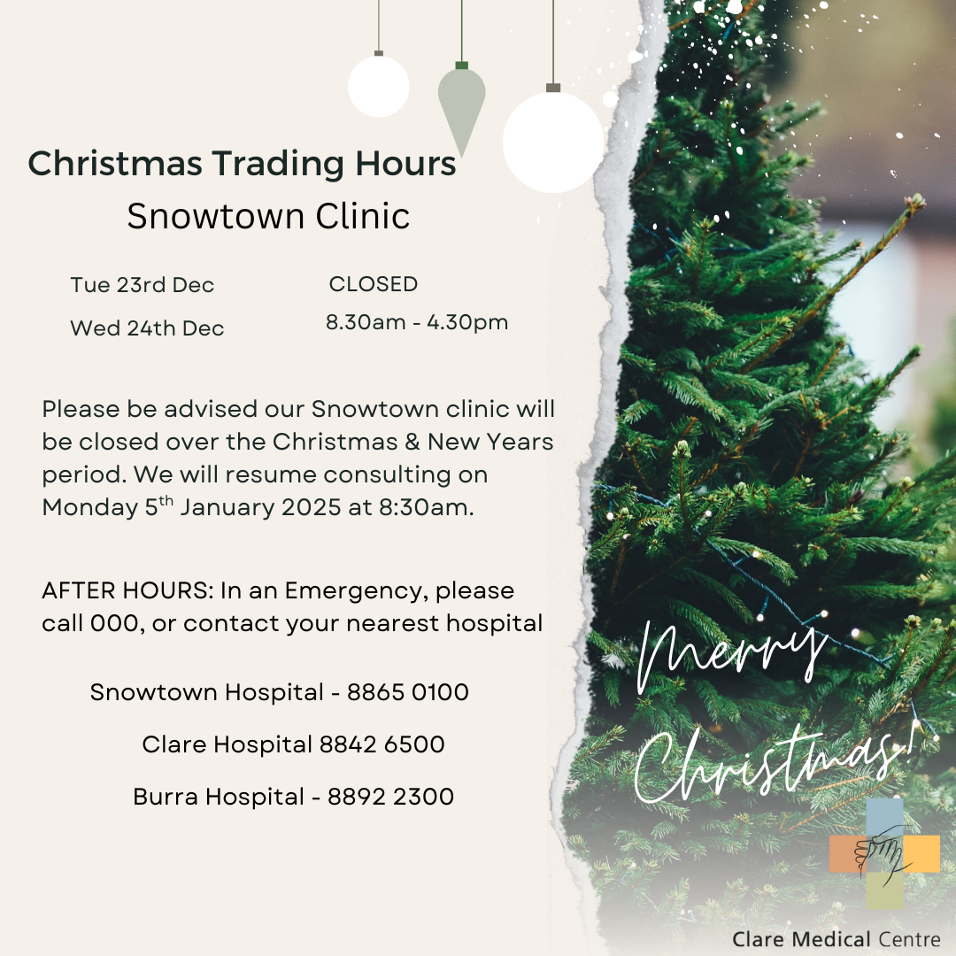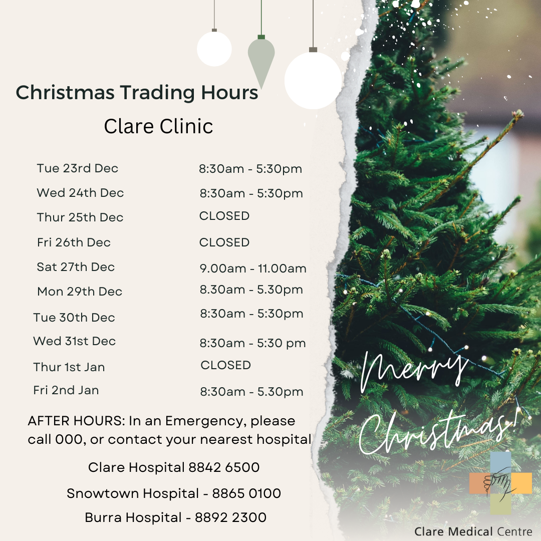Please be advised that our clinic operating hours over the Christmas & New Years period have changed.